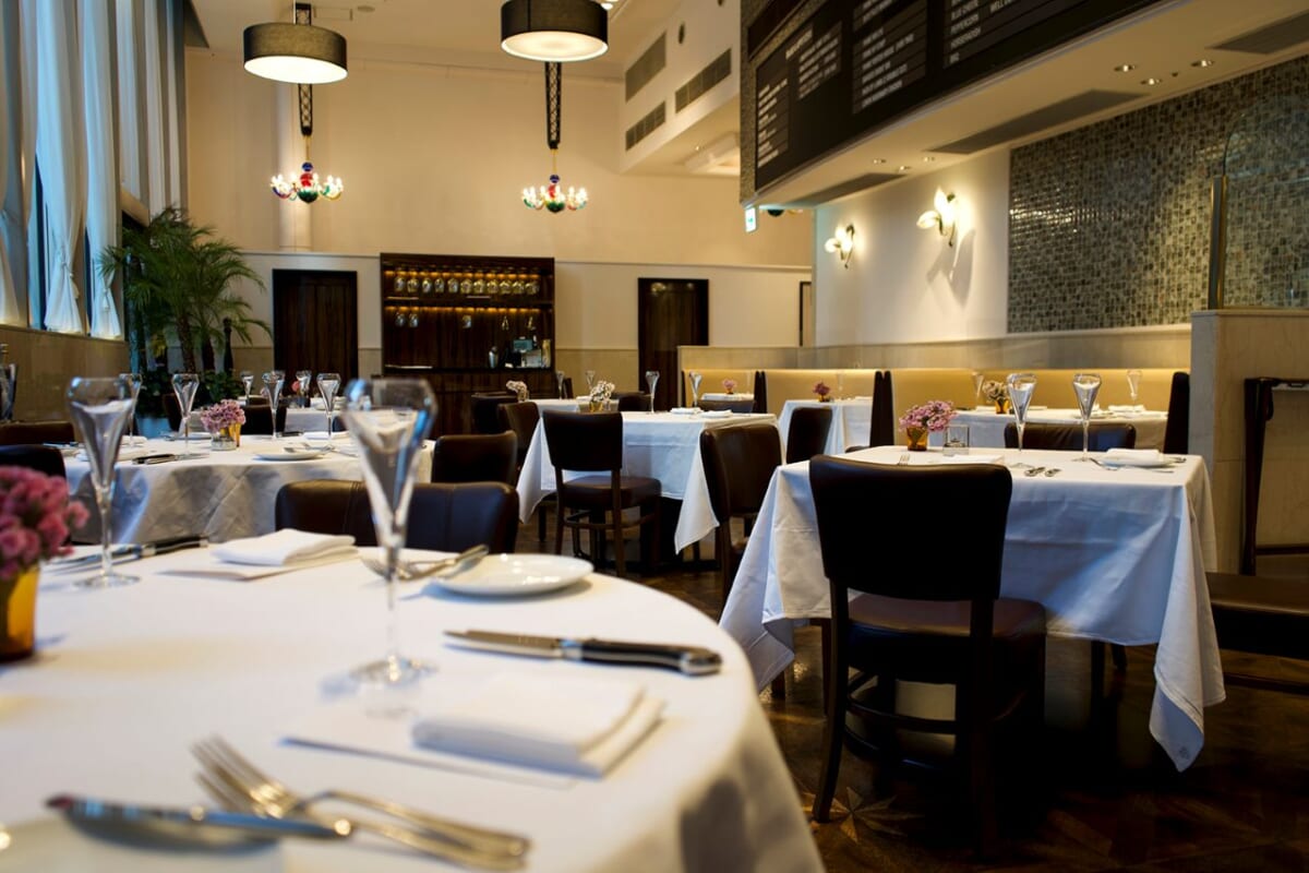 2014年9月に日本1号店としてオープンし、2020年7月にリニューアル。1階のメインダイニングは、天井高6メートルの開放感あふれる空間にゆったりと席を配置。